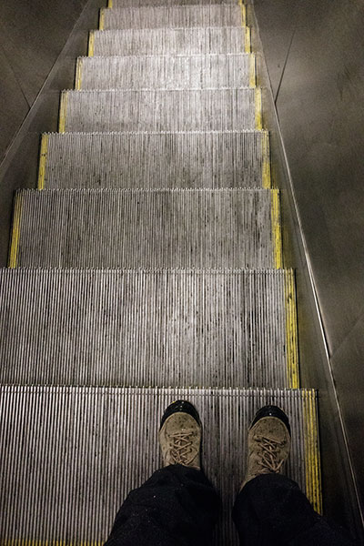 I dag var det temat ”i trappan” som skulle fotograferas. Det har varit med förut, då fotograferade jag vårt fina trapphus. Eftersom det ösregnade och allt bara blev miserabelt blev det en grottmörk bild från tunnelbanan i dag. Jag vet inte om jag tycker att det är så roligt att temaorden återkommer. Visst, man tvingas tänka ett nytt varv på temat, men jag tycker att det snarare är tjatigt än inspirerande. ”Been there, done that” liksom. Nä. Nya ord åtminstone. Kanske därför denna bild blev lite håglös också. Nå. Så går det.