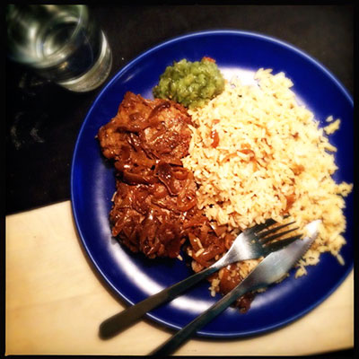 I dag var temat för dagen lunch. Ett ganska roligt ord. Finns ju många möjliga bilder på temat. Det blev svårare när denna måndagen var en sån där dag när det fanns tusen ärenden att ta hand om, jag åkte kors och tvärs över stan samtidigt som det ösregnade. Jag var blöt, stressad, hungrig… Nå. Till sist kom jag hem och eftersom vi varit bortresta i helgen och inte lagat någon mat var det ont om grejer att fixa lunch med. Som tur var hade vi ännu kvar av pannbiffarna vi stekte förra veckan, så jag kokade ris, värmde biffarna och löken och rotade fram lite bostongurka som fick piffa upp. Enkelt men jättegott för vrålhungriga mig. 😛