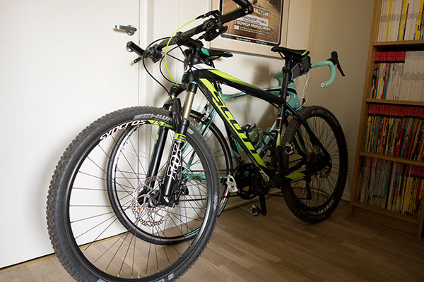 Eftersom vi bor rätt trångt och det inte finns mycket till förråd som tillhör lägenheten och den cykeltokige maken äger ett flertal cyklar och jag själv har två, så har vi lite utrymmesproblem. En del av vårt arbetsrum har därför blivit cykelgarage. Jag vet inte riktigt hur vi ska lösa detta, men så är läget just nu i alla fall. Så här ser det ut i vårt ”garage”.