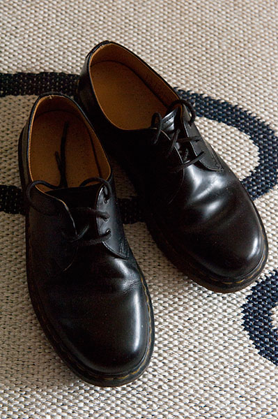 I dag var det temat svart som skulle fotograferas. Svårt. Att plåta nåt som är riktigt svart är knepigt. Det är ofta klurigt att få till konturer och känslan för föremålet utan att det sotar igen. Svarta saker blir lätt så oformliga eftersom man inte ser detaljerna tydligt. Jag högg makens Dr Martensskor och plåtade mot vita hallmattan. Det blev rätt fint!
